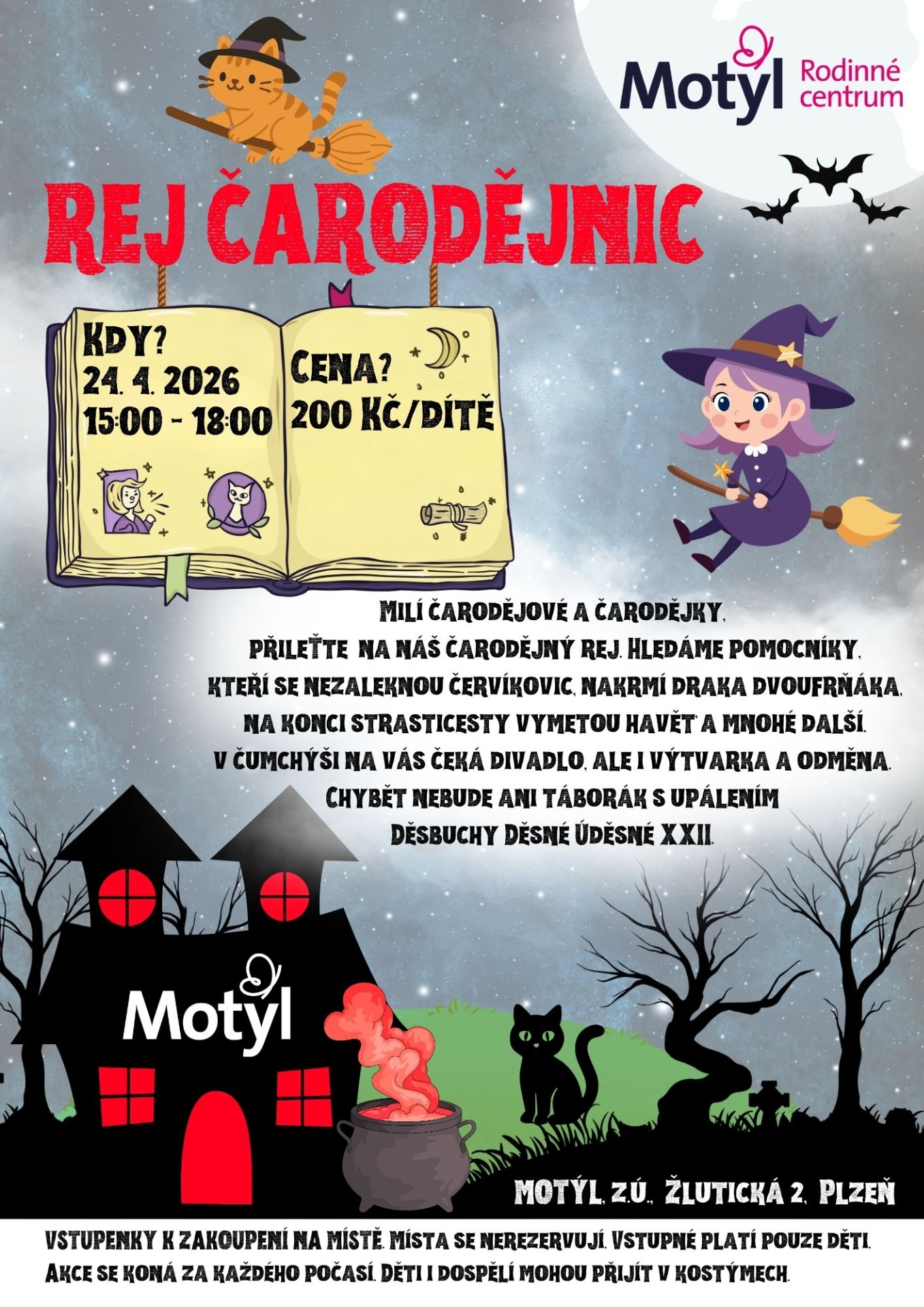 Pro děti je připraveno 10 soutěžních stanovišť, např. si děti procvičí létání na koštěti, hledání pavoučího drahokamu, třídění kouzelných lektvarů, lovení červů na čarodějnickou večeři nebo přiloží dřevo do kamen. V tvořivé dílně si vyrobí děti obrázek čarodějnice. Čeká je jedna pohádka O statečném pejskovi čaroděje Kostitřasa, vystoupení Tanečního kroužku, upálení Děsbuchy Děsné Úděsné XXII., táborák.